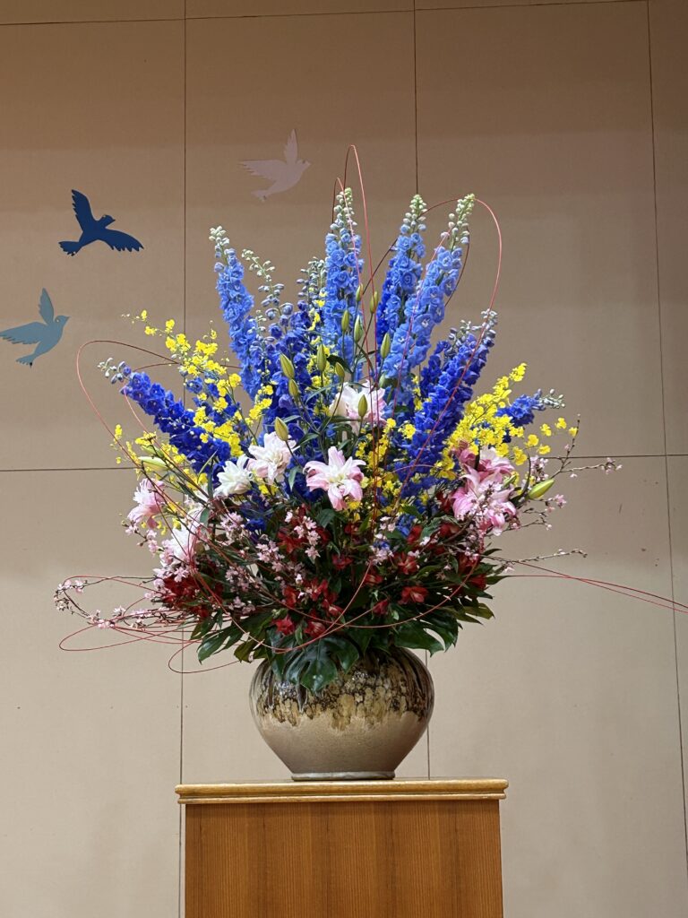 大きな花器が、卒業式用に飾り付けされた体育館にとても良くマッチして、華やかさを添えることができました。